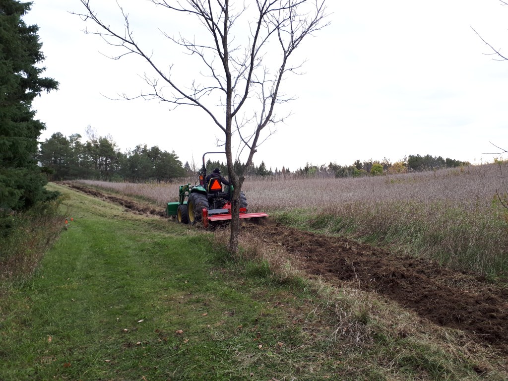 Farm Manager Sarah and I started preping for the arrival of the TRCA on Monday by bush-hogging, ploughing and tilling a strip up along the ‘Bowl’. We were concerned at first that the job would be hard but the plough made short work and soon we were admiring the rich crumbly soil our new plants were going to call home.
