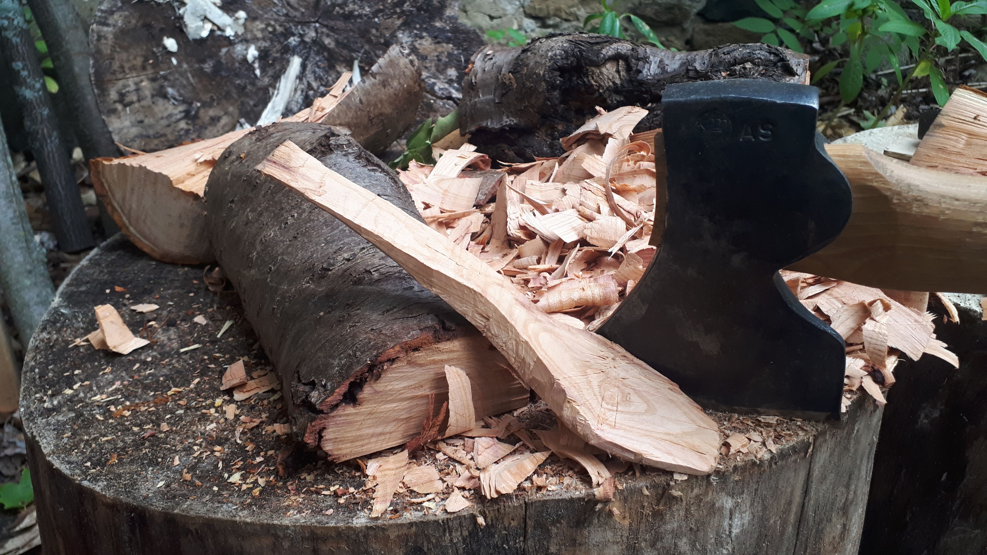 The trunk was about 6 inches in diameter and about 7 foot high and i could see from the get-go it wasn’t going to cleave straight; and so it was, a spiralling growth pattern revealed that cleaved into twisted halves. The wood is beautiful, a richness and colour to it that is so pleasing after carving basswood for a bit too long. At the edges, and here and there through the woo, a dark purple ( or plum!) stain from the sap was visible that gives an overall feeling of raspberry ripple ice cream!. Perhaps I could have used a different cleaving technique or instead used a saw to cut the wood, but I had what i had, and made the best of it. Once I started carving away with my axe the spoon began to emerge.