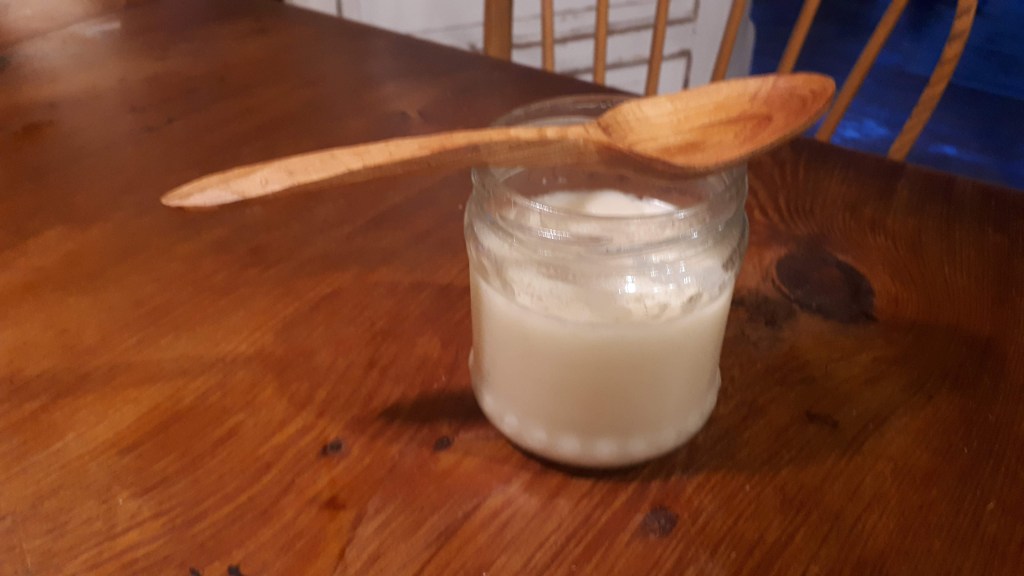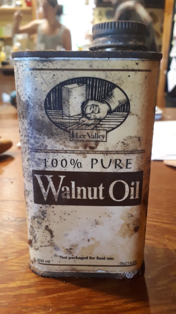 Of course a good spoon needs a good finish and having got to the end of the raw linseed oil I found in Poppa’s workshop I was delighted to find a small tin of Walnut Oil (from Lee Valley in Ottawa) hiding away behind paint thinners and other wood preservatives. I have also wanted to combine my oil with beeswax to make something more protective and had some kindly given to me from Larry at Humber Valley Honey that has been sitting on my desk for some time. Using a recipe from Garden Betty I made up our first batch of Mount Wolfe Farm Spoon Butter as well. I’m now wondering if I can make some locally sourced walnut oil from the black walnuts that hammer down on the roof every Autumn, so our Spoon Butter would be a truly sustainable product!