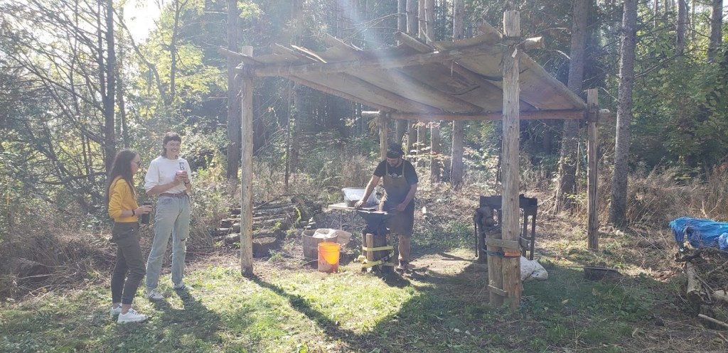 Earlier today Sarah and I met by the Forge (Wayland’s Other Smithy) looking for a space to place the new storage box John had fashioned for the steel and tools so they don’t have to take up space in the Drive Shed. Sarah was busy with pack-ups for the day’s CSA pick-up and I was taking a walk between stints on a scoping essay for my PhD Comps exam. With a site selected, as we moved to return to our respective tasks, I reminded Sarah that I was due at Whole Village this afternoon for a tour with my PhD Supervisor and another colleague.
