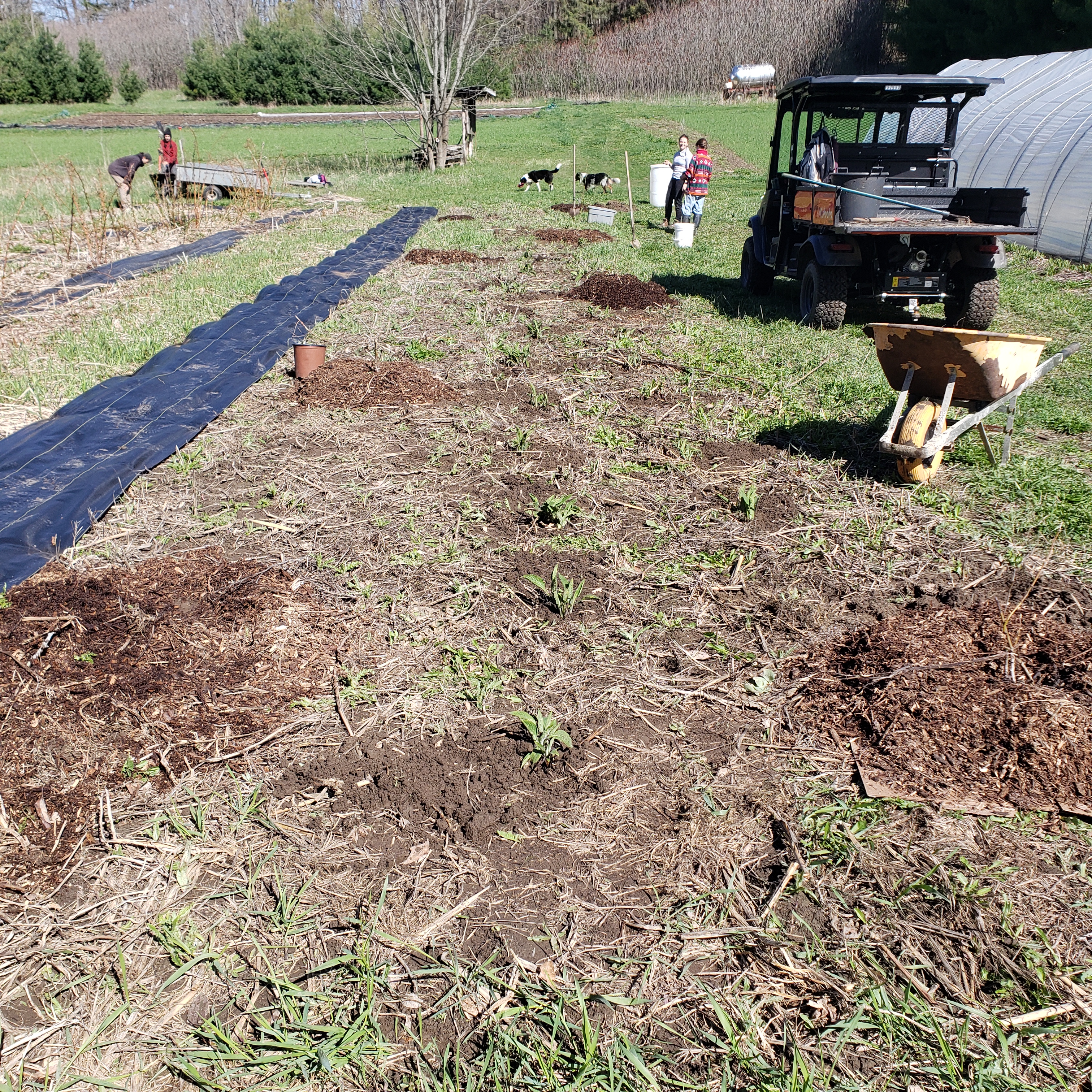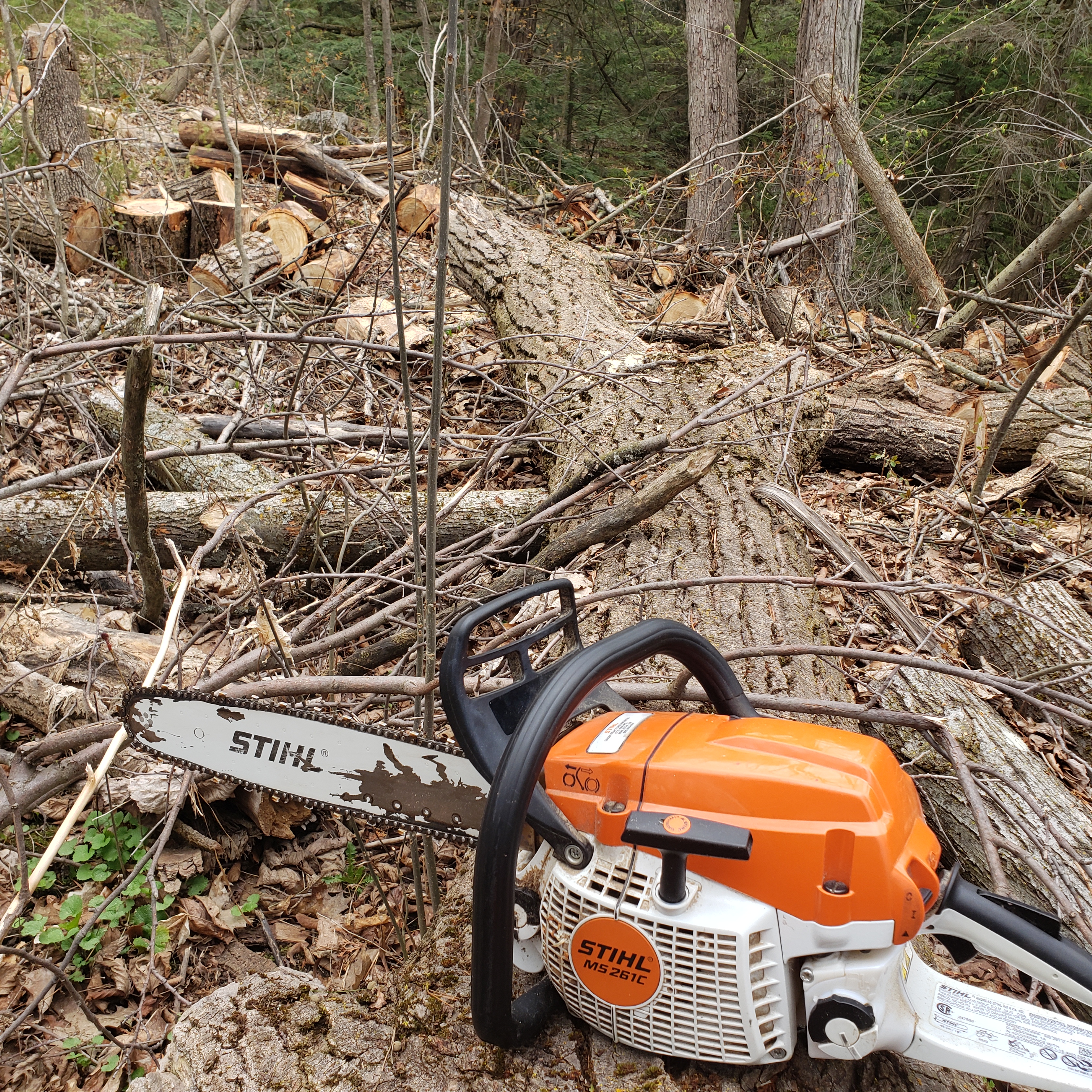 As the Winter turned into Spring I have been getting outside as time permits using my forestry skills to fell some trees for trail clearance, thinning and mushroom log harvest and cutting some cedar for construction projects. We are reopening a trail next to Cold Creek which hasn’t been used for so long it’s got mature white pines on it, but the main trail through the grassy bowl is so eroded it needs some well-earned rest. At the top of the new trail I felled a large spruce that had been killed by the recent Spongy Moth outbreak so the tractor and trailer could make a full turn. I am so grateful to have taken some basic training using a chainsaw for the Hedgerows for Dormice project I ran for PTES back in 2009-11. In another life I might have liked to be an arborist.